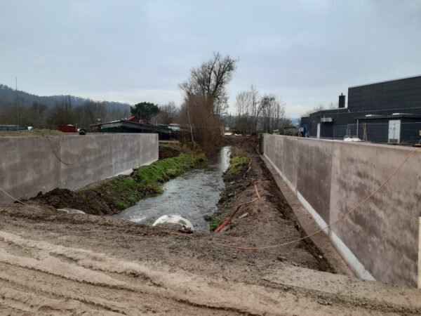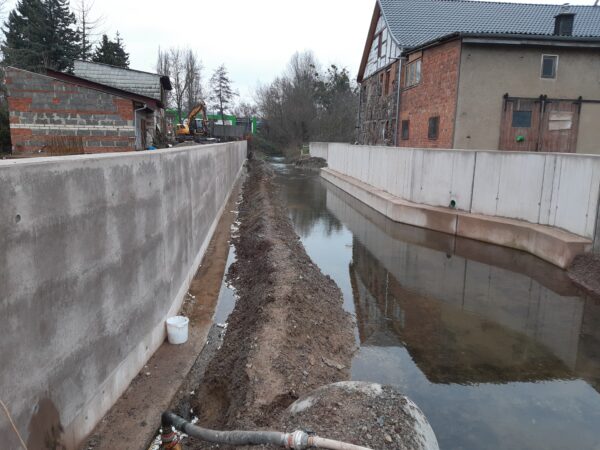 Im Maßnahmenkomplex Spicke verläuft die bauliche Umsetzung des Hochwasserschutzes am Mühlgraben und Roten Bach weiterhin planmäßig. Die Hochwasserschutzwände der Bauteile 4 und 5 wurden durchgängig hergestellt. In den letzten Wochen erfolgte die Betonage der Hochwasserschutzwände des Bauteils 3 (am Übergang zum Roten Bach) sowie des Bauteils 1 (entlang der rechten Mühlgrabenseite). Die restlichen Schal- und Betonarbeiten werden vorbehaltlich der Witterung zeitnah abgeschlossen.