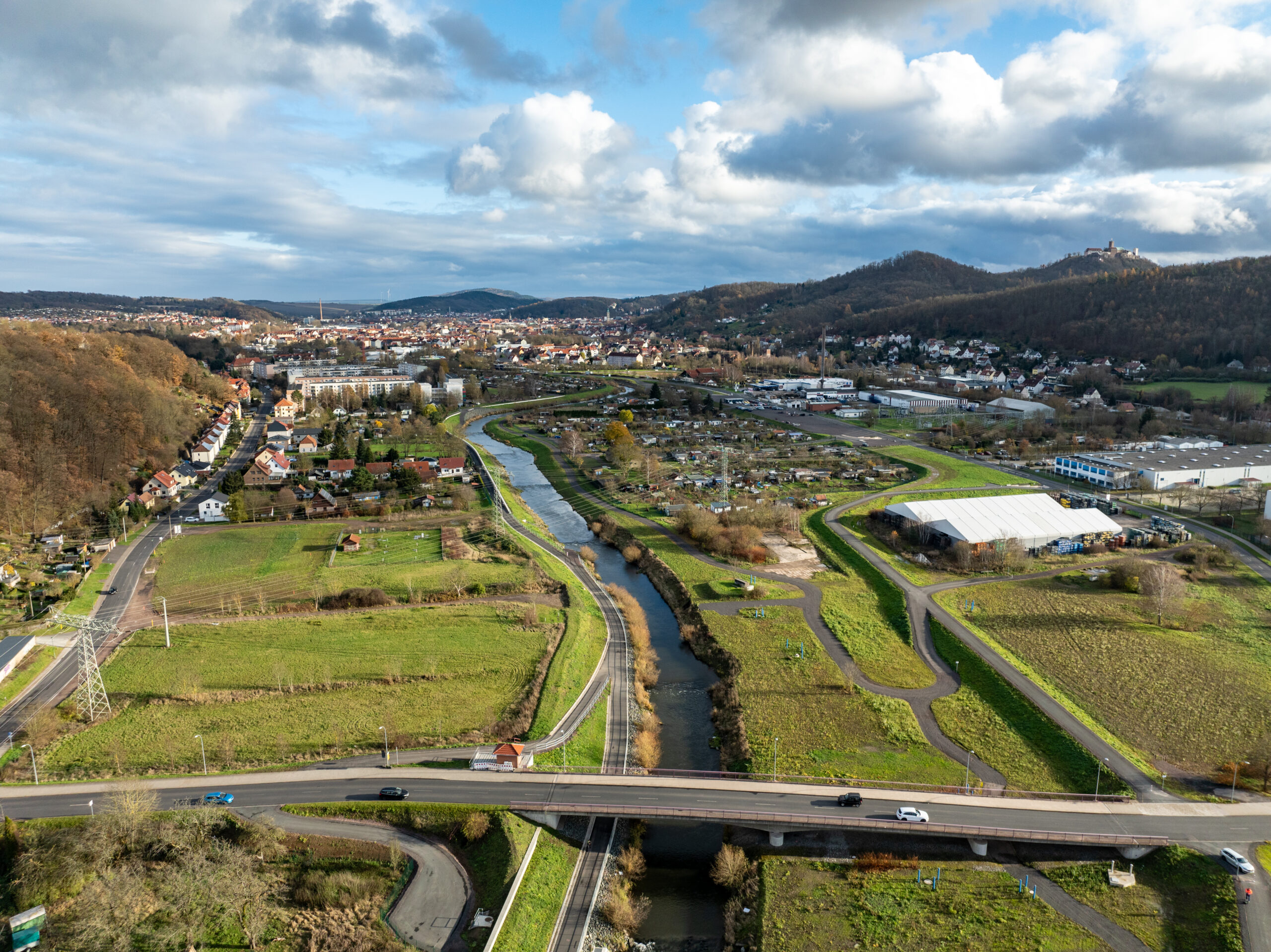 Blick in Fließrichtung der Hörsel mit Gewässerstrukturmaßnahmen, der Hochwasserschutzwand entlang des Gewerbegebiets und dem Unterhaltungs- / Geh- und Radweg rechts der Hörsel