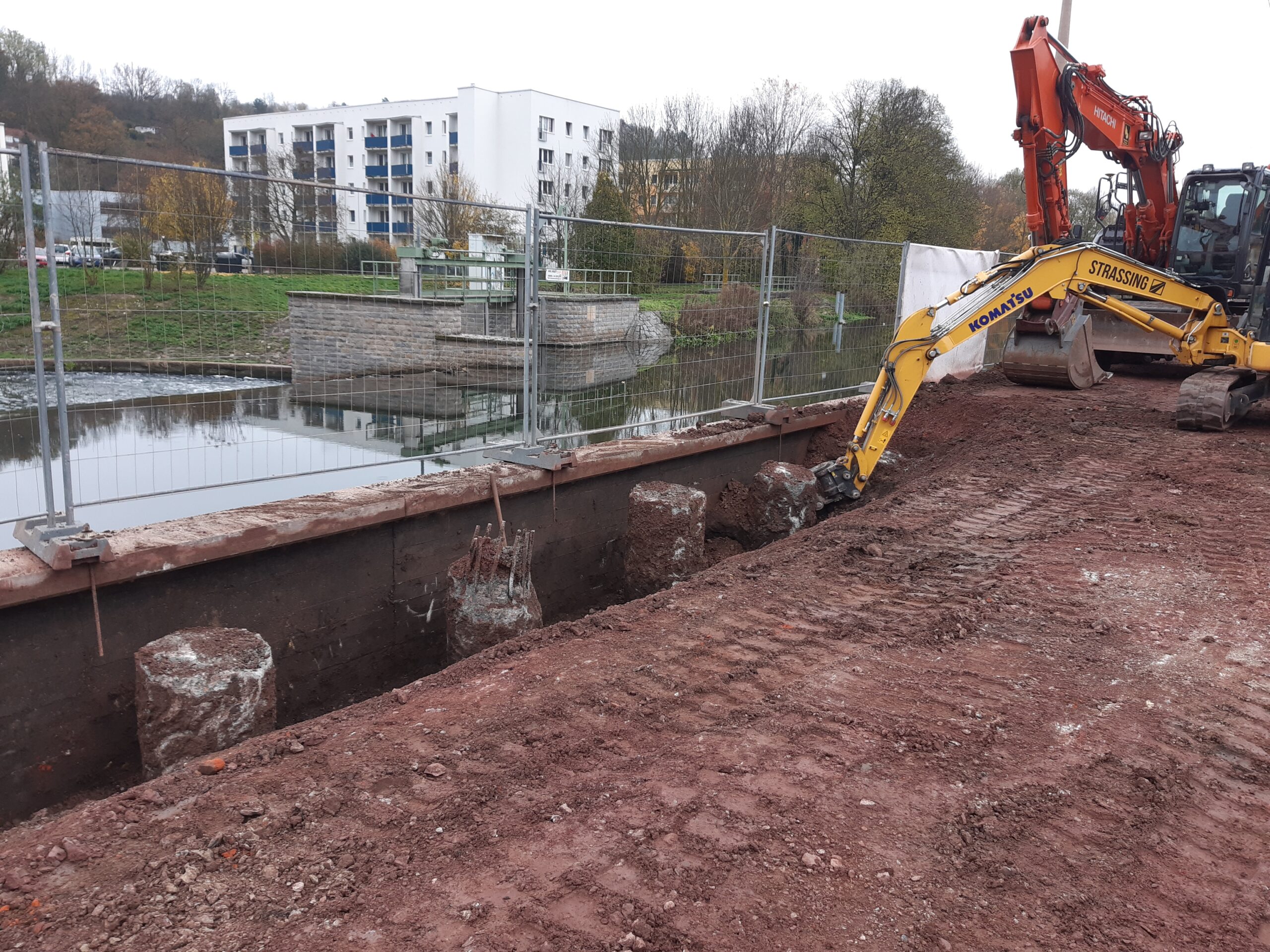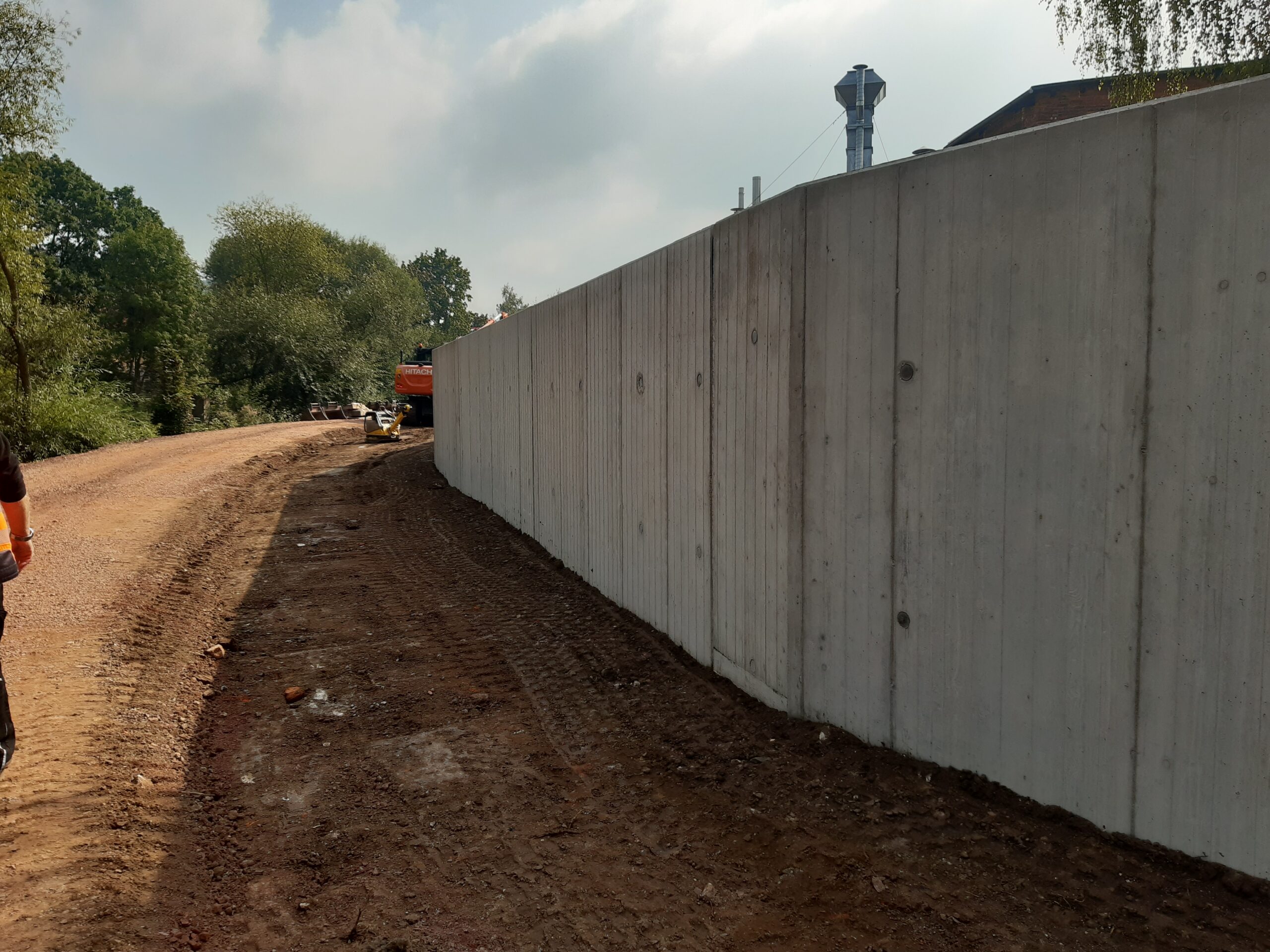 Die bestehende Ufermauer oberhalb des Palmentalwehres wird als Hochwasserschutzwand ausgebildet und in dem Zuge erhöht. Statt der ursprünglich vorgesehenen Flachgründung musste in dem Bereich aufgrund vorhandener Leitungsbestände auf Tiefgründung umgestellt werden. In Vorbereitung ist die Herstellung der Hochwasserschutzwand entlang der Hörsel auf Höhe der AWO und der Kita Spatzennest. Die Arbeiten beginnen dort erst jetzt, weil der Gehölzbestand zumindest noch über den Sommer 2024 erhalten werden sollte.