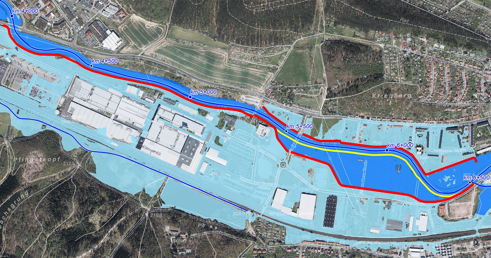 Für das Industriegebiet wird zusätzlich zum Hochwasserschutz vor einem HQ(100) der Hörsel ein höherer Freibord festgelegt, so dass bei Überschreitung eines HQ(100)-Ereignisses die Hochwasserschutzanlagen im Bereich des Industriegebietes nicht überströmt werden. Dieser höhere Freibord wird auf Basis der Wasserspiegellage eines HQ(200) Hörsel ermittelt.